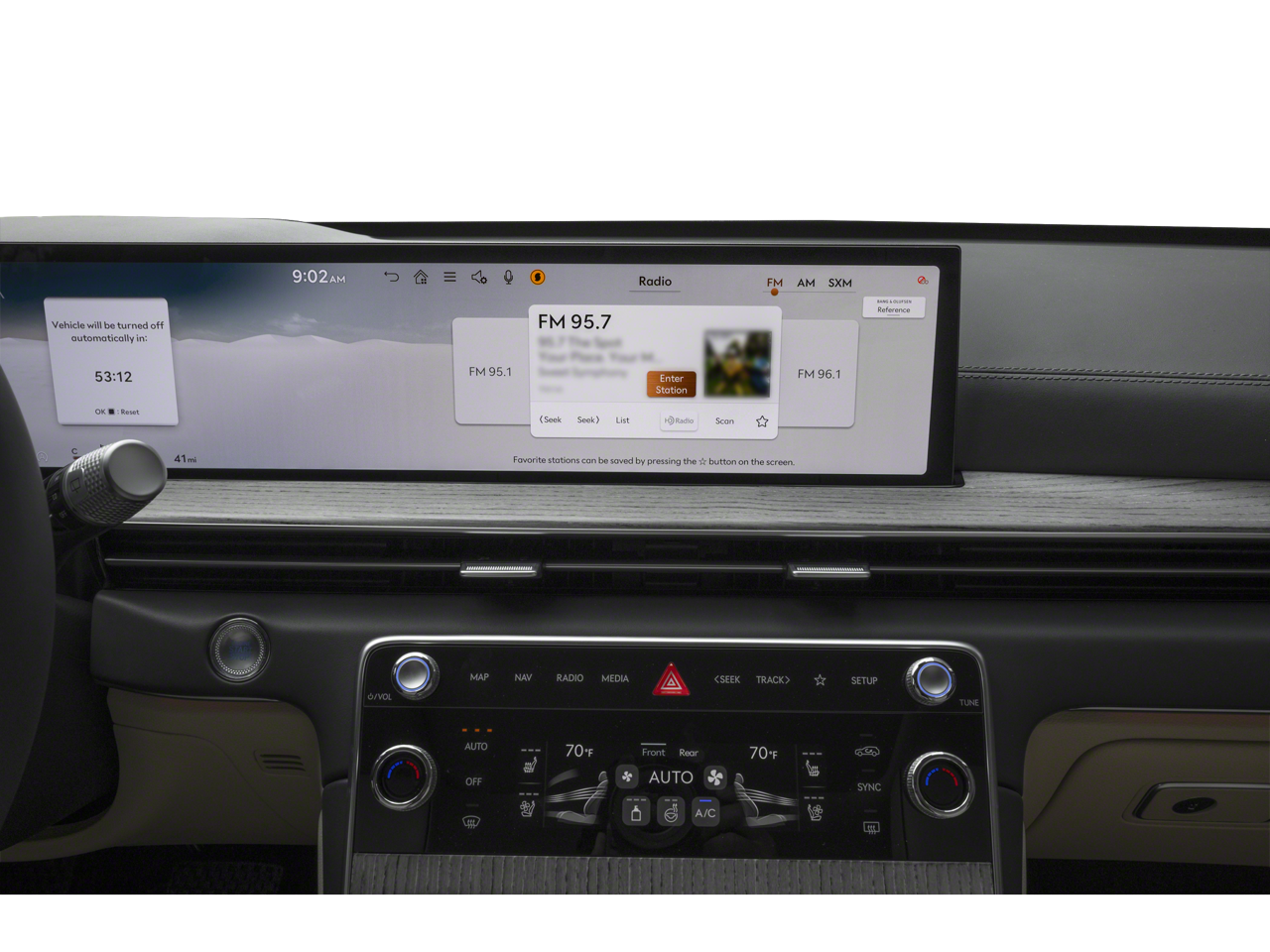 - Radio: AM/FM/SiriusXM/HD Bang & Olufsen Sound Sys -inc: 1400 watts, 18 speakers, 14 channel amplifier, 27" integrated OLED instrument cluster and navigation system, SiriusXM Radio w/90-day subscription (not available in AK or HI), cloud connected platform (cloud profiles, connected routing, dynamic voice recognition, OTA updates), wireless Apple CarPlay, wireless Android Auto, Bluetooth® hands-free phone system w/audio streaming, wireless phone charger, Wi-Fi hotspot, steering wheel controls, USB and Genesis Connected Services Wireless Apple CarPlay and wireless Android Auto are late availability.